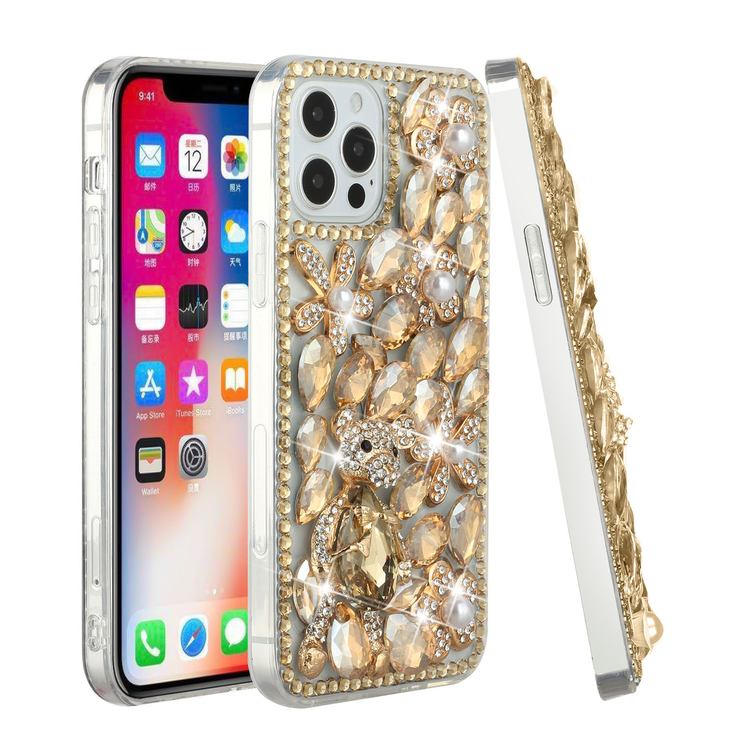 For iPhone 15 Plus Full Diamond with Ornaments Hard TPU Case Cover - Gold Panda Floral