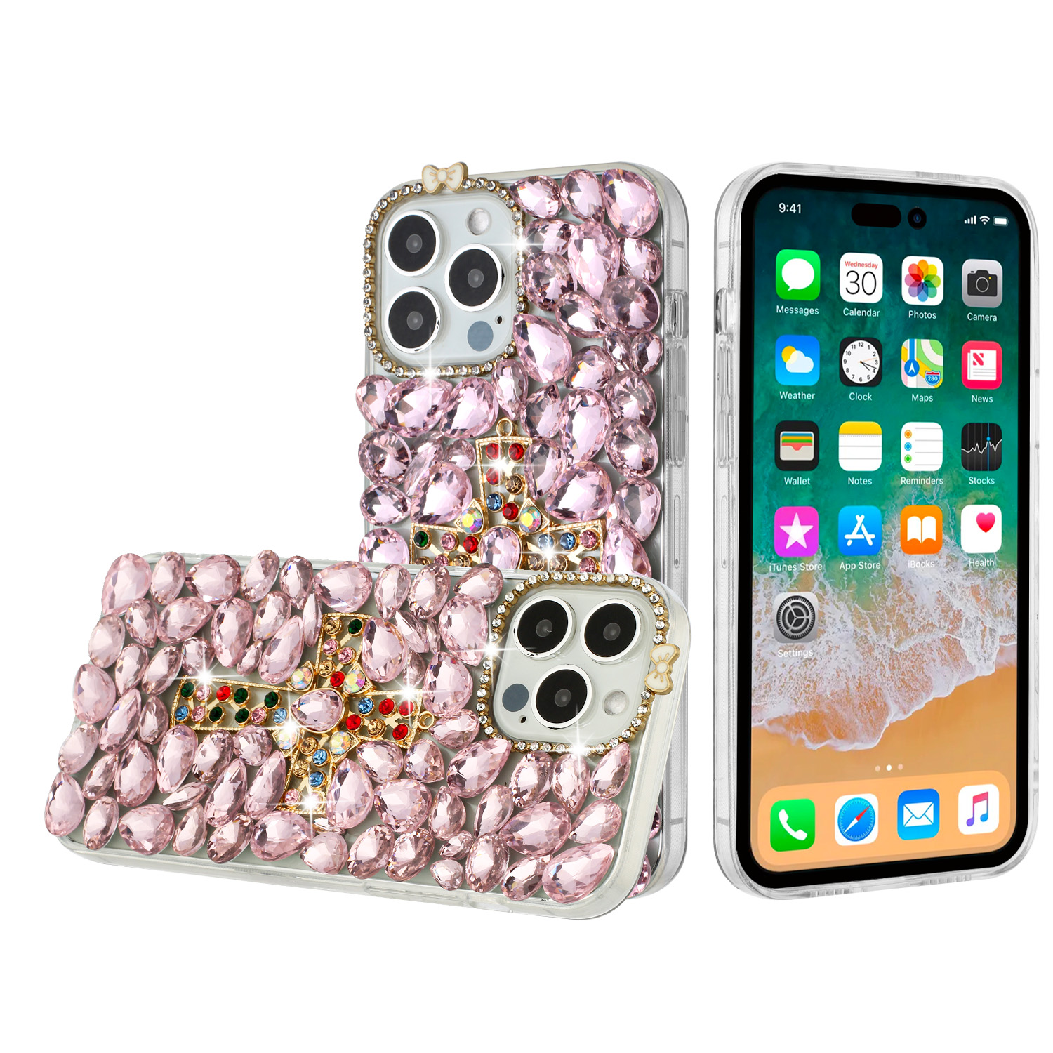 For iPhone 15 Cross Full Diamond Bling Case Cover - Pink