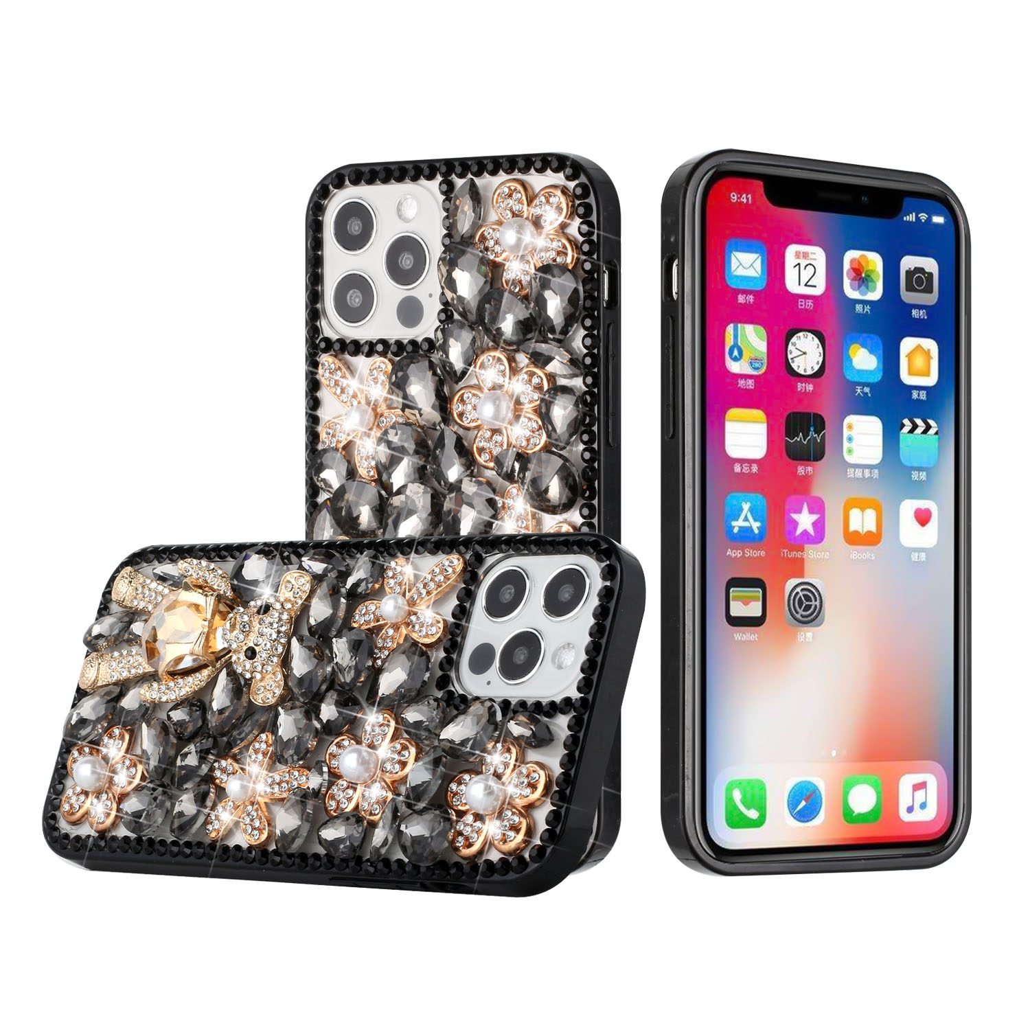 For Apple iPhone 11 (XI6.1) Full Diamond with Ornaments Case Cover - Black Panda Floral