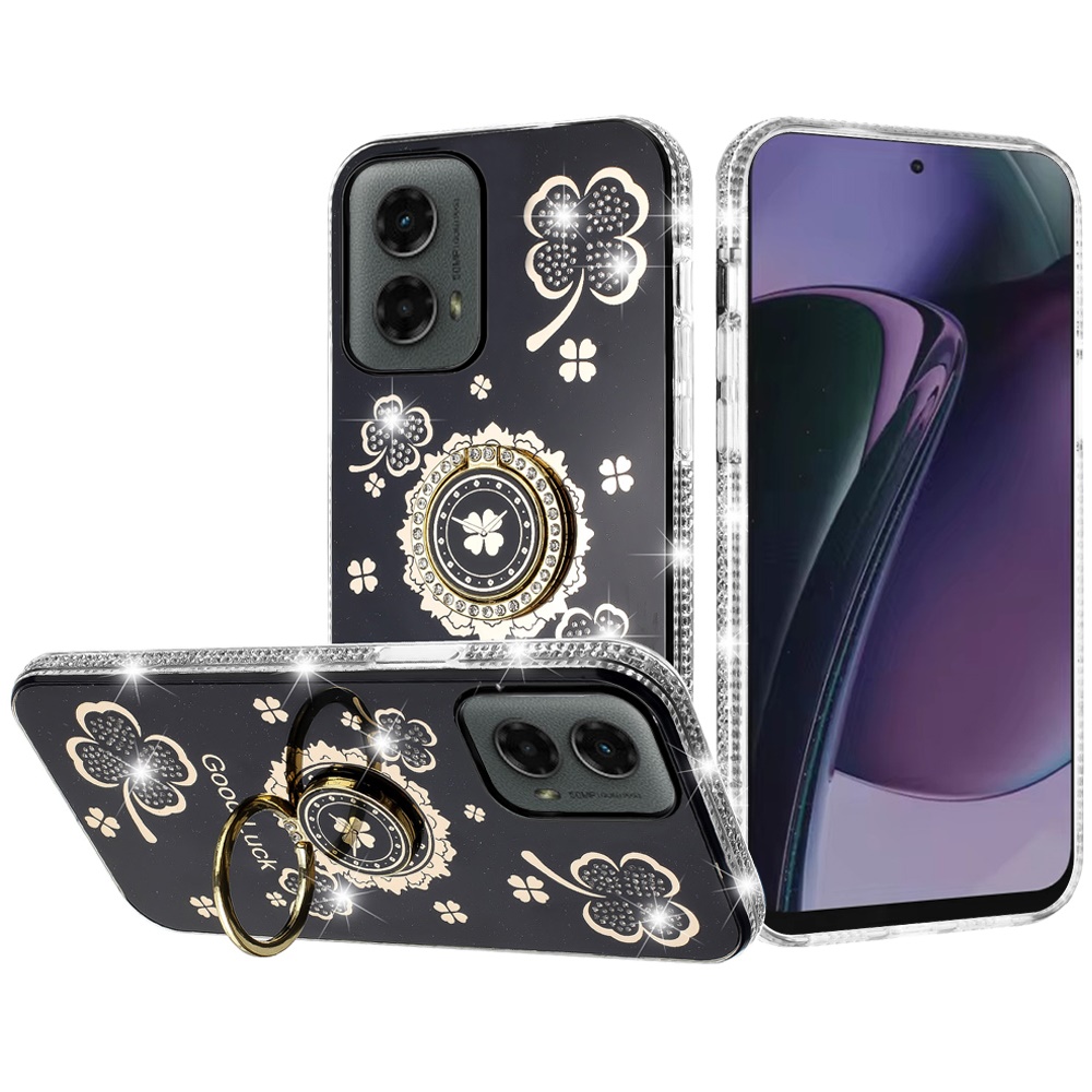 For Motorola Moto G Stylus 5G 2024 Splendid Glitter with Diamonds All Around Edges Ring Stand Case Cover - Black